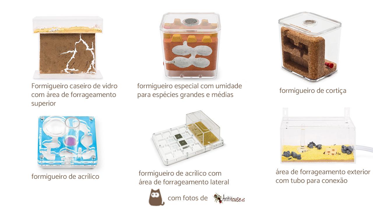 Existem muitos tipos de formigueiro, tanto comerciais quanto caseiros. Podemos encontrar alguns de terra, onde se começa sem buracos. Nestes, as formigas devem cavar por si mesmas, e eles podem ser uma opção muito interessante para os curiosos que desejam saber como é um formigueiro por dentro, vendo o processo da maneira mais natural possível. Em outros casos, você pode optar por formigueiros com espaços pré-fabricados, nos quais provavelmente será melhor observar o processo, mas de uma maneira mais artificial.
