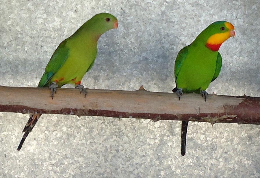 - Periquito-real-australiano: As fêmeas possuem rosto, cabeça e garganta de cor verde, enquanto que os machos apresentam tons de vermelho nessas zonas. Até aos 3 anos de idade, os exemplares jovens não adquirem suas cores definitivas.