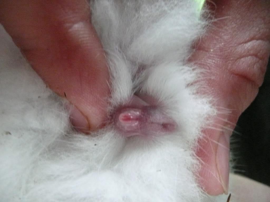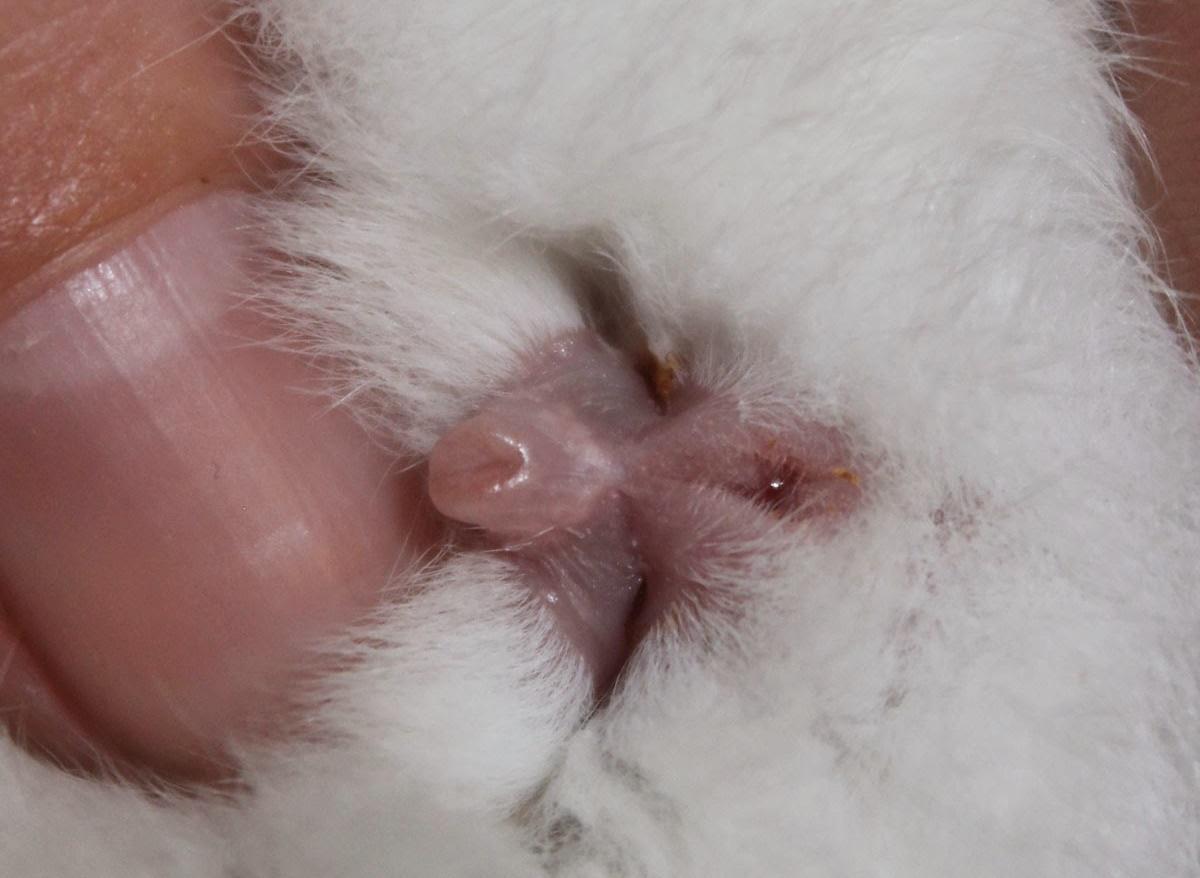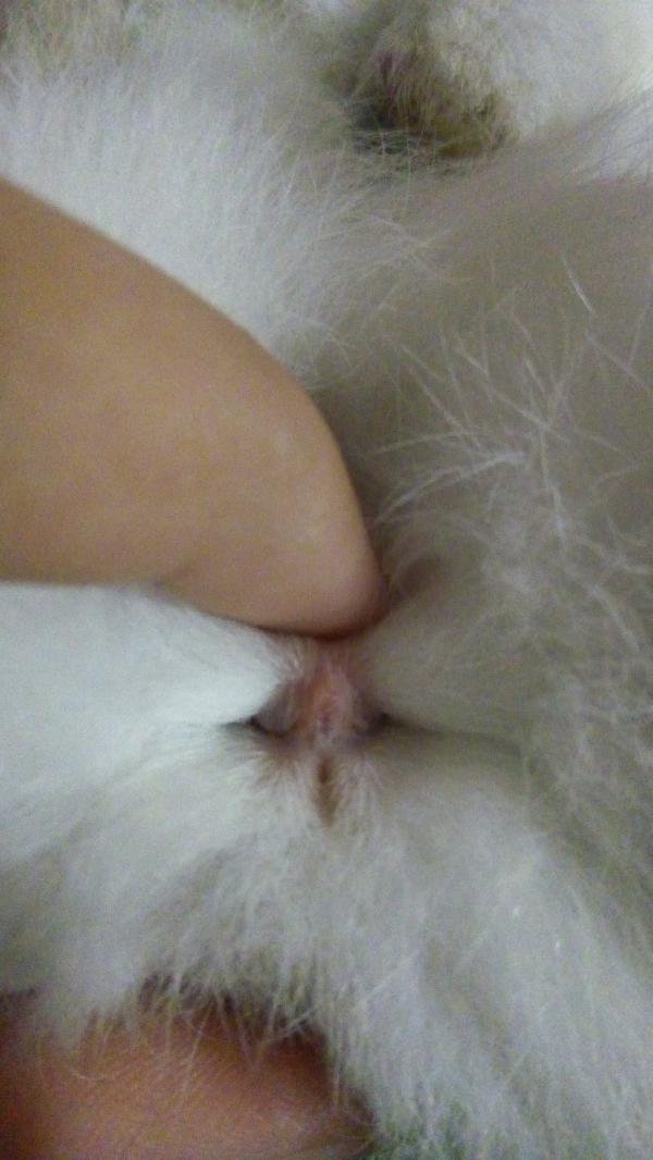 Se tem um pouco mais de experiência com crias de coelhos, pode puxar com muito cuidado o rabo e pressionar com muita delicadeza sobre o segundo orifício. Se se tratar de um macho, isto deixará o pênis visível, um pequeno cilindro. Se não acredita ser capaz de fazer esta operação com o tato necessário, é melhor que o evite fazer para não magoar o coelho.