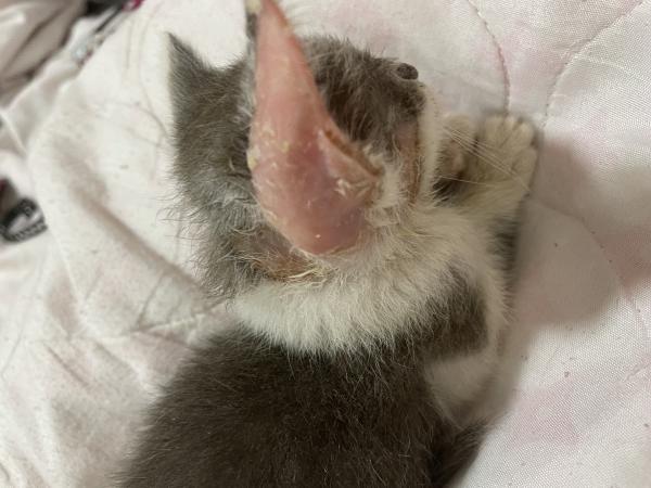 Essa gata foi resgata e tem por volta de 20 dias de vida. Ela sofreu maus tratos e quase morreu. Do nada começou a cair o pelô da bochec, ombro e orelha. Ela come a ração filhote origens. O que pode ser?