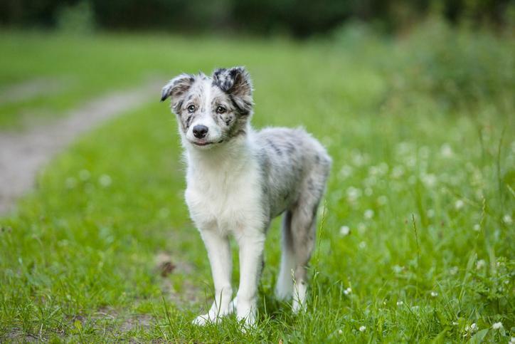 Como nos demais merles, a presença do alelo dominante M faz com que ocorra uma diluição irregular da cor, de modo que três cores aparecem. Nesse caso, as cores do Border Collie que vemos são areia, preto e branco.