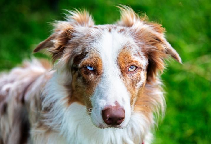 No border Collie red merle, a cor base é marrom, mas sempre merle devido à presença do alelo dominante Mm. A cor merle vermelha é bastante rara, pois exige que a combinação do alelo bb recessivo apareça na cor chocolate.