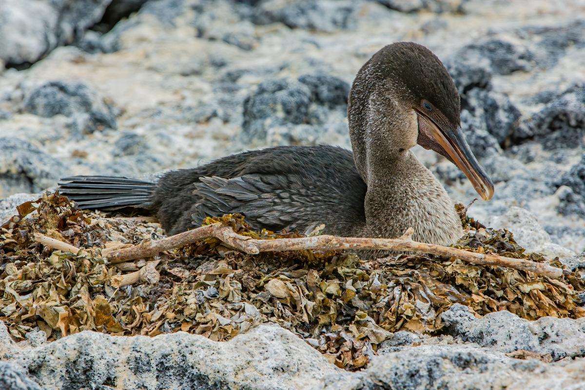 Phalacrocorax harrisi é o único cormorão que não voa, devido à perda dessa capacidade. É exclusivo das Ilhas Galápagos e é uma das espécies mais fascinantes e especializadas de sua família. Com cerca de 90 cm de comprimento, essa ave perdeu a capacidade de voar, mas suas asas curtas e musculosas estão perfeitamente adaptadas para nadar debaixo d'água. Sua plumagem escura contrasta com seus olhos turquesa brilhantes, e seu comportamento está completamente ligado ao ambiente marinho.