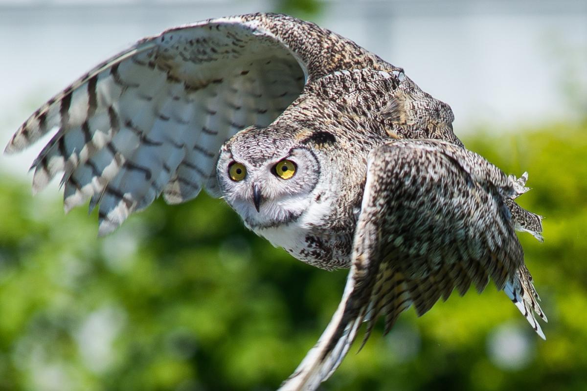 - Corujão-orelhudo (Bubo virginianus): sua plumagem se camufla perfeitamente entre troncos e galhos de árvores em seu habitat natural;
