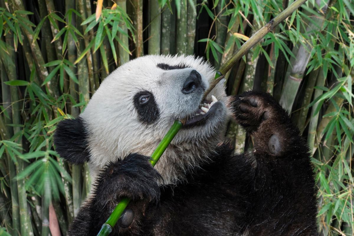 Iniciamos nossa lista de curiosidades sobre os pandas destacando sua alimentação. Apesar de ter um sistema digestório carnívoro, 99% da dieta de um panda é vegetariana, tendo o bambu como principal fonte de alimento, que também inclui raízes, caules, brotos e folhas. Mas justamente por não ser projetado para processar matéria vegetal, seu organismo não quebra facilmente a celulose do bambu, fazendo com que ele coma quase que sem parar.