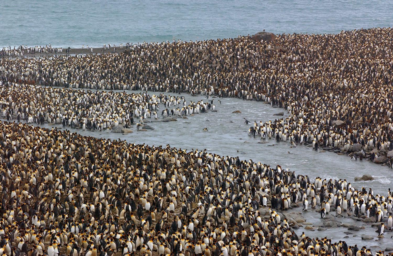 Algumas colônias podem se tornar muito numerosas. É o caso do pinguim-macaroni (Eudyptes chrysolophus), grupo onde se estimam que vivam por volta de 5 milhões de casais. Suas atividades em grupo não só incluem o compartilhamento de espaços fora d'água e a interação, mas em alguns casos eles também caçam juntos.