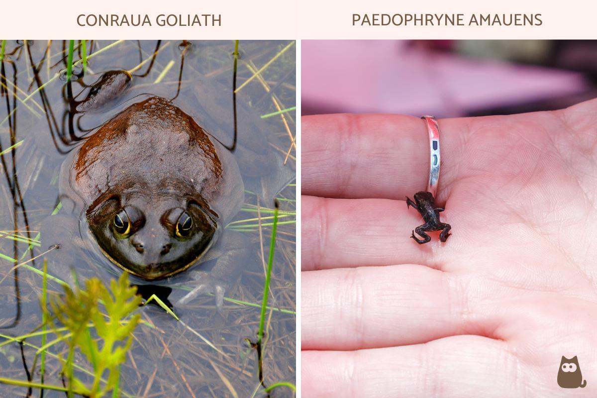 No outro extremo temos a espécie Paedophryne amauens, nativa de Papua Nova Guiné, que mede aproximadamente 7 mm, o que não somente faz dela o menor sapo do mundo, mas também o menor vertebrado que existe.