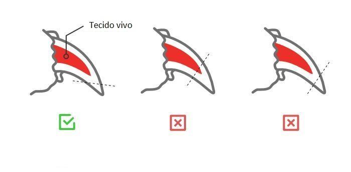 - Para cortar a unha deve colocar simplesmente a tesoura à altura adequada e exercer a pressão necessária para realizar um corte rápido e limpo. A posição adequada é aquela que mostra um corte reto ou ligeiramente descendente. Desta forma, evita cortar as unhas do seu cachorro em forma diagonal ascendente. Confira na imagem