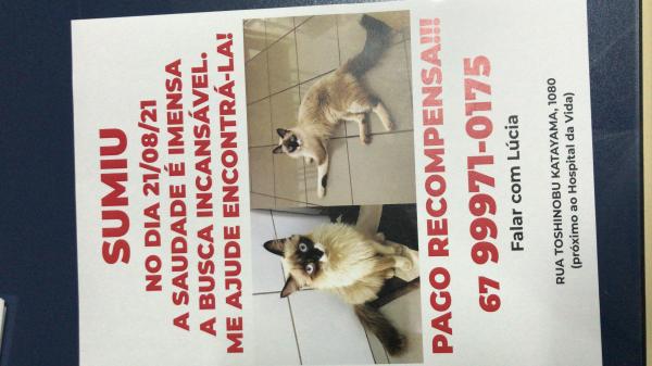Minha gata sumiu dia 21/08/2021. Estou muito triste, ela está comigo desde que nasceu, é minha companheira, por favor se alguém a viu entre em contato. Rua Toshinobu Katayama, 1080, em Dourados-MS.