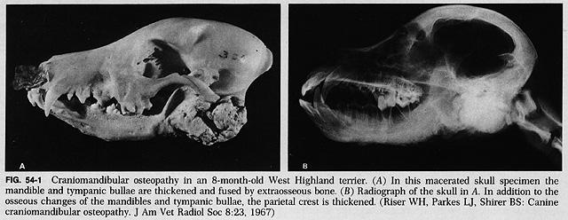 Consiste no crescimento anômalo do osso da mandíbula, embora, por sorte, desapareça perto dos 12 meses de idade. No entanto, o westie que é acometido da doença necessitará de um tratamento sistemático a base de anti-inflamatórios enquanto estiver doente, em razão da dor que o cachorro sente e para assegurar que não tenha dificuldades na hora de se alimentar.