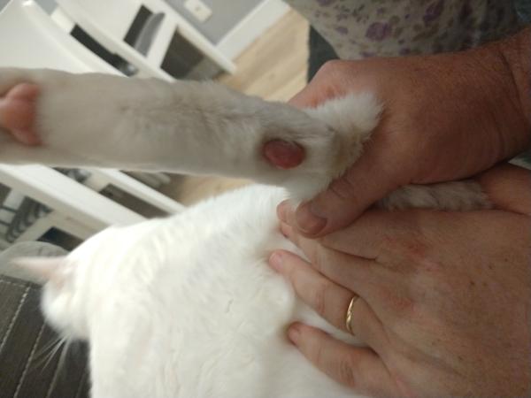 Boa noite! Apareceu esse "hematoma" na pata traseira do meu gato. Já pesquisei e não achei nada que se assemelha a isso.