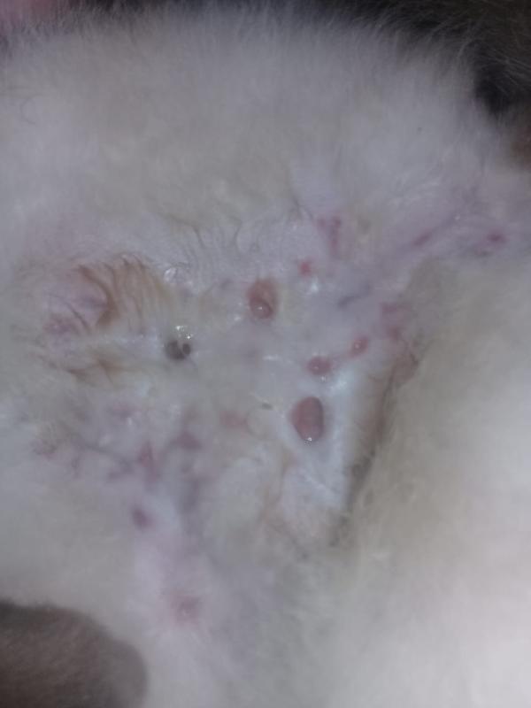 Um conhecido me mandou uma foto da barriga do gato, já adulto, sem pelo no local, parece estar cheia de líquidos por baixo da pele com alguns furos, em 30 anos que cuido de gatos , nunca vi algo assim.