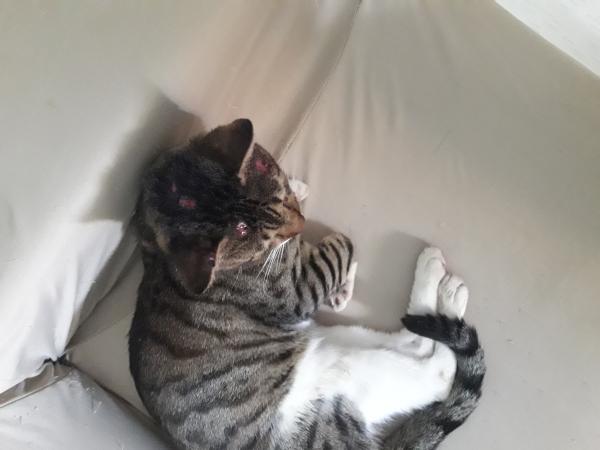 Acabei de adotar está gatinha de 9 meses que tem estas falhas sobre os olhos. É normal?