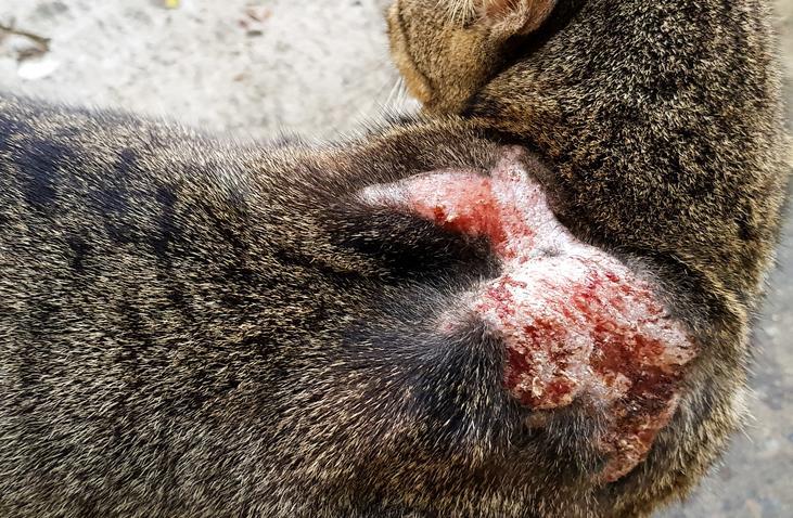 Esse problema de pele em gatos é causado pela exposição ao sol e afeta as áreas mais claras e sem pelos, principalmente as orelhas, embora também possa aparecer nas pálpebras, nariz ou lábios. Começa com vermelhidão, descamação e queda de pelo. Se a exposição continuar, feridas e crostas aparecem, causando dor e arranhões, o que piora a condição. No caso das orelhas, o tecido é perdido e pode degenerar em carcinoma espinocelular, que é um tumor maligno. É necessário evitar contato direto com o sol, usar proteção e, em casos graves, intervir cirurgicamente.