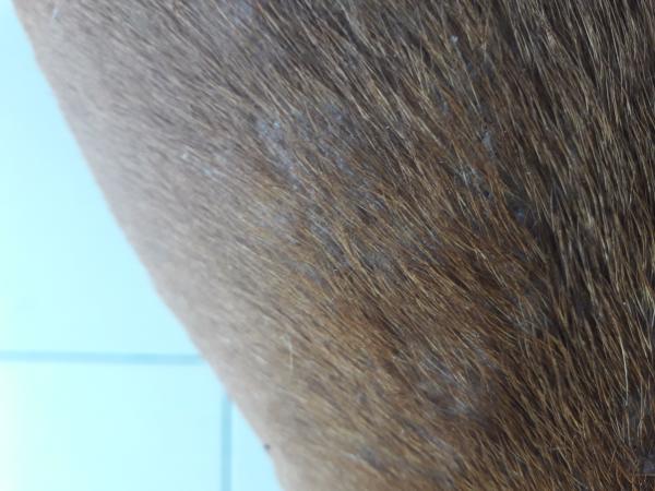 B tarde tenho uma box , esta com 3 anos ela esta com ploblemas  na pelagem , com pequenos caroços com aspectos escamoso. o que pode ser ?