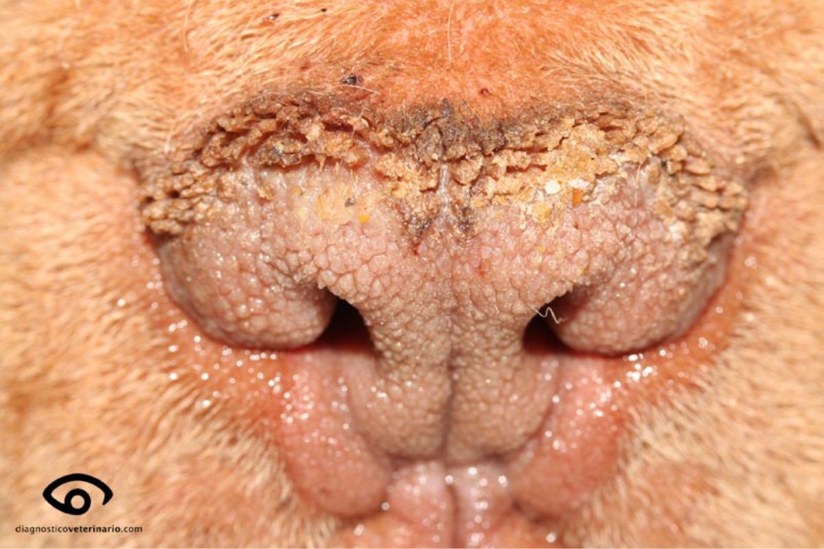 - Lupus eritematoso discóide: se trata de uma doença autoimune, que afeta de forma local o plano nasal provocando despigmentação, eritema, erosões e úlceras a nível da trufa e na porção dorsal do plano nasal.