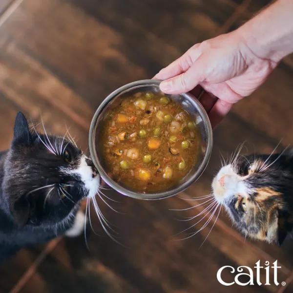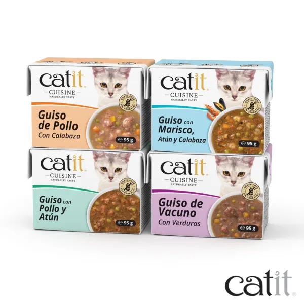 Neste caso, a gama Catit Cuisine Guiso é um alimento complementar, ou seja, foi concebido para ser administrado ao gato como parte de uma dieta mista, combinada com a ração seca. Por outro lado, Catit Cuisine Paté e Catit Cuisine Mousse são alimentos completos que, portanto, podem ser oferecidos exclusivamente ao gato, ou seja, um gato ficaria bem comendo apenas Catit Paté ou Mousse.