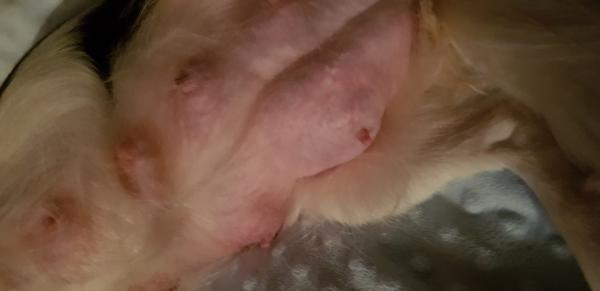 a minha cadela está a amamentar e agora as quatro semanas esta a ficar com as maminhas muito inchadas  mais de um lado que do outro que devo fazer