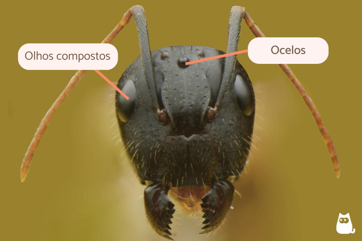 - Ocelos: além dos olhos compostos, muitas espécies de formigas possuem três ocelos, que são olhos simples localizados em um triângulo na parte superior da cabeça. Os ocelos não servem para ver imagens detalhadas, mas percebem a luz e a escuridão, ajudando na orientação e no ciclo diário.