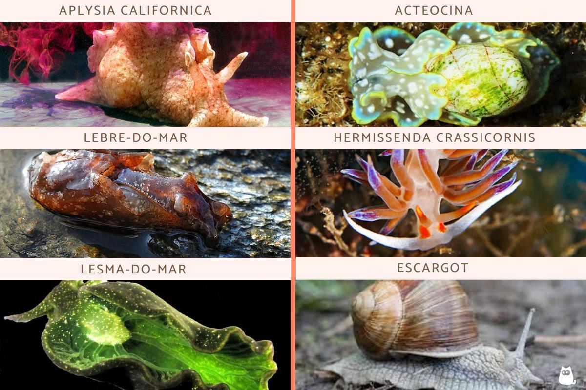 - Os nomes comuns incluem: lesmas marinhas, lebres marinhas, borboletas marinhas e conchas canoas.