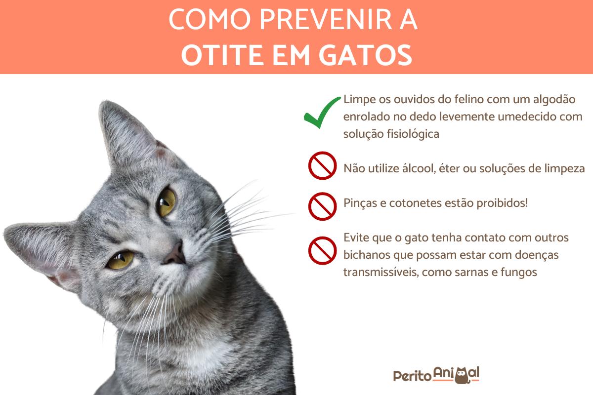 Nunca utilizar álcool, éter ou soluções de limpeza que não sejam formuladas especificamente para gatos. Pinças e cotonetes são proibidos! Esses instrumentos podem machucar muito o conduto auditivo, além de empurrar a sujeira para locais mais profundos. Ainda, é aconselhável evitar o contato com outros animais que possam estar com doenças transmissíveis, como sarnas e fungos.