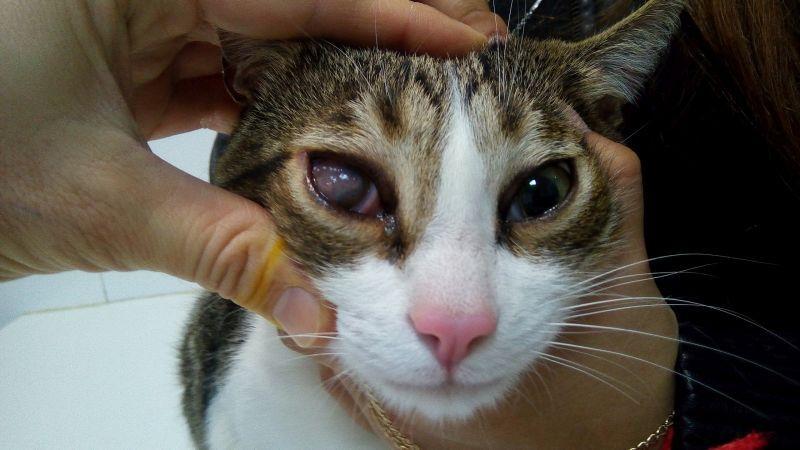 Apresenta-se como uma conjuntivite leve persistente, acompanhada de rinite (espirros e secreção nasal), lágrimas aquosas ou purulentas, febre e perda de apetite. Com menor frequência e dependendo do estado imunológico do felino, a infecção pode passar para os pulmões. Se não for diagnosticada e tratada a tempo, a conjuntivite pode ser complicada por úlceras córneas e edema conjuntival, que é quando, justamente, pode-se observar o olho esbranquiçado ou tampado.