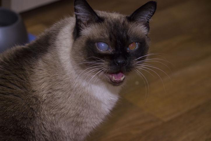 A catarata ocorre quando o cristalino (lente que permite o foco dos objetos) perde sua transparência de forma parcial ou total e, portanto, se não for tratado a tempo pode provocar cegueira no olho afetado. É um problema bastante comum em felinos de idade avançada e que possui múltiplas causas, sendo a principal a degeneração senil do cristalino provocada por um processo de degeneração e dessecação. Também pode ser hereditária ou congênita, embora seja muito pouco frequente. Da mesma forma, doenças sistêmicas como diabetes ou hipocalcemia, traumatismos, uveíte crônica, toxinas e/ou úlceras também podem provocar o aparecimento de catarata em gatos.