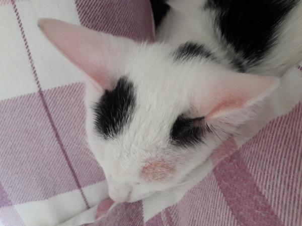 Boa tarde, Adotei recentemente uma gatinha de 3 meses, preta e branca, que parece ter pouco pelo em cima de um dos olhos e nas orelhas, que estão avermelhados/cor-de-rosa (anexo fotos). O que pode ser? Devo usar alguma pomada / champô especial? Obrigada, Inês Godinho