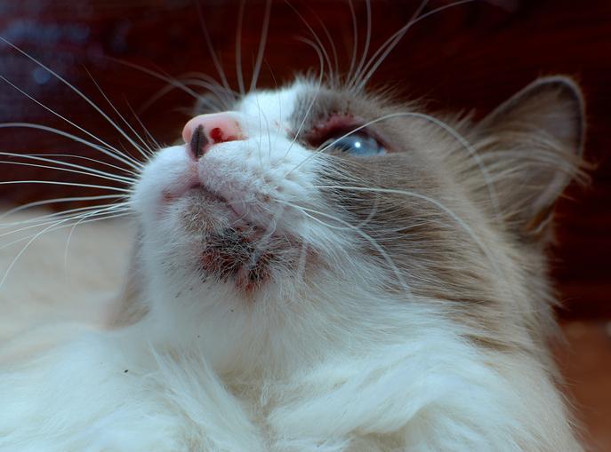 Todos os gatos têm pelos um pouco mais finos acima dos olhos do que os demais, o que permite que a pele seja vista mais facilmente, especialmente sob a luz do sol ou luz intensa. Entretanto, esta finura aumenta com a idade, aparecendo dos 14 aos 20 meses de idade nos gatos mais predispostos e sendo particularmente evidente na velhice, quando eles podem parecer ter áreas calvas na região superior dos olhos. Vale notar que os gatos de cor escura, especialmente os pretos, são mais propensos a sofrer desta condição onde esta finura é mais evidente, pois há um maior contraste entre a cor do pelo e a pele.