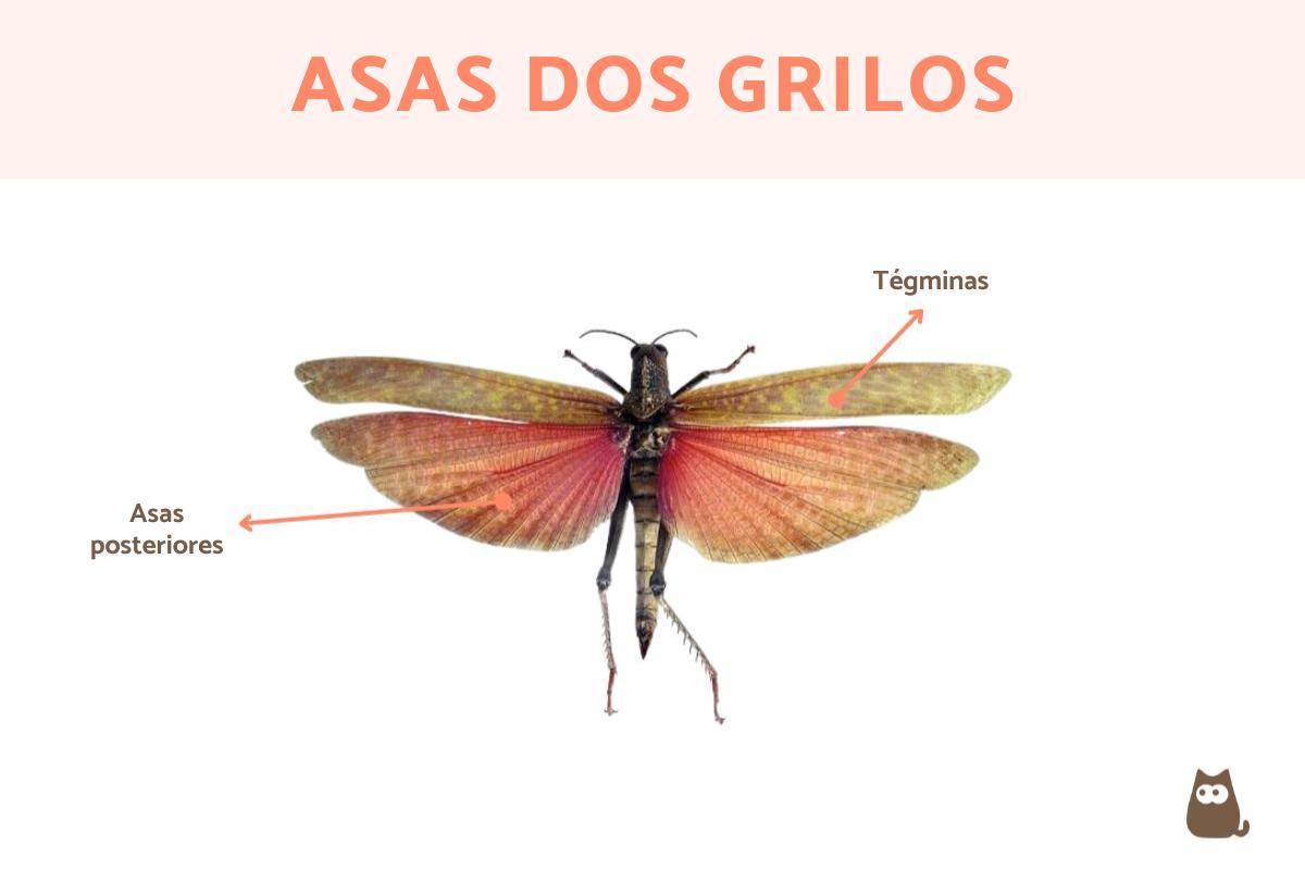 Os grilos estão anatomicamente adaptados tanto para o voo quanto para o salto, de modo que podem executar ambas ações. No entanto, em relação ao voo, dependendo da espécie de grilo, podem apresentar dois pares de asas de tamanhos variados, estando em alguns casos bastante reduzidas ou ausentes, assim nem todos os grilos podem voar. Quando os dois pares de asas estão presentes, as primeiras são conhecidas como "tégminas" e correspondem a estruturas altamente esclerotizadas, formadas por quitina, o que lhes confere uma dureza particular. Também costumam apresentar uma nervura própria de cada família, uma característica distintiva nos ortópteros. No caso dos machos, é onde estão localizados os órgãos estriduladores, usados para produzir o típico som dos grilos. Em seguida, encontramos o segundo par, que, quando presentes, são as asas propriamente ditas. Estas se dobram ou dobram-se sob as tégminas e são caracterizadas por serem membranosas; se estiverem bem desenvolvidas, permitem então o voo nos grilos.