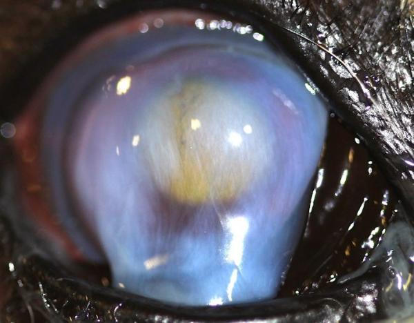A ceratite é visualmente vista como uma mancha no olho do cachorro. Isso se deve à inflamação da córnea, que a faz perder transparência. Além disso, podem ser observados abundantes rasgos, intolerância à luz ou protrusão da terceira pálpebra. O cão vai ficar coçando com sua pata.