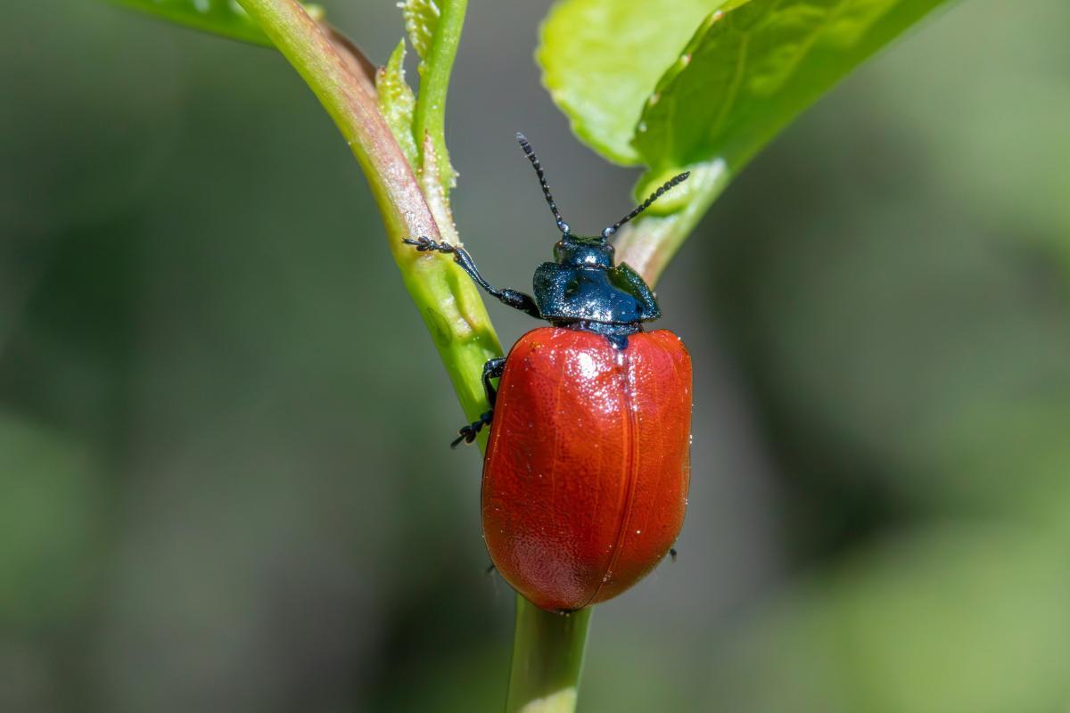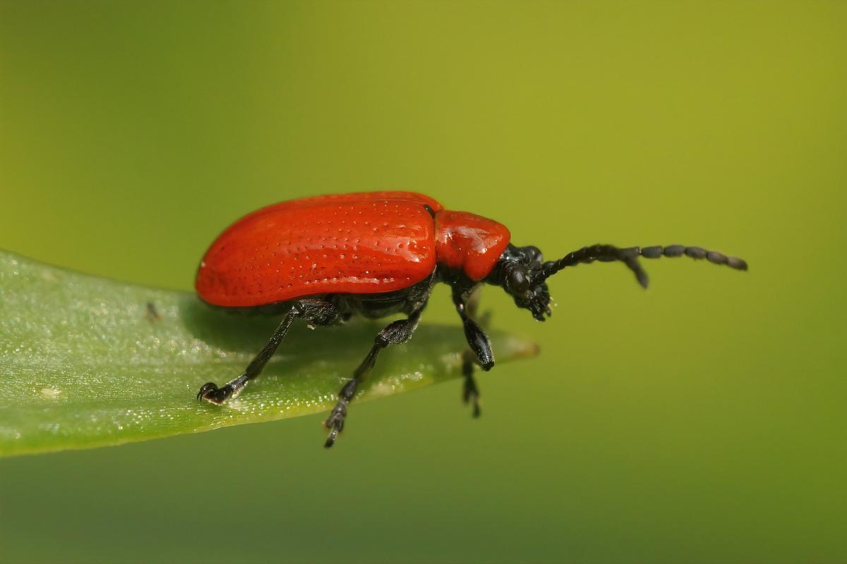 Lilioceris lilii, inseto da família Chrysomelidae, devido à sua cor vermelha brilhante, pode ser confundido com joaninhas sem manchas. No entanto, ao contrário delas, ele é uma praga que ataca lírios e outras plantas perenes, alimentando-se de folhas, caules e flores.