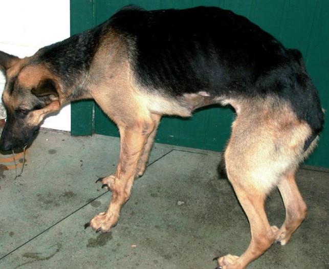 Na foto abaixo observamos um Pastor Alemão com atrofia acinar pancreática, em que é possível notar caquexia e atrofia de musculatura: