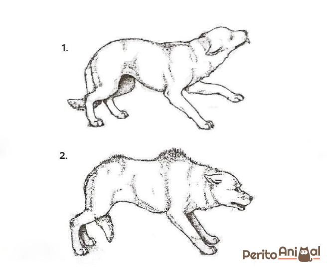 - Na segunda figura, observamos um cachorro com agressividade ofensiva. Mediante estes sinais de alerta, tente afastar o cachorro, pessoa ou objeto que está causando esta reação. Podemos observar o pelo eriçado, o focinho enrugado, os dentes e as extremidades muito rígidas e tensas. A cauda normalmente está virada para cima. Costumam soltar um latido curto num tom alto que revela que estão chateados com a situação.