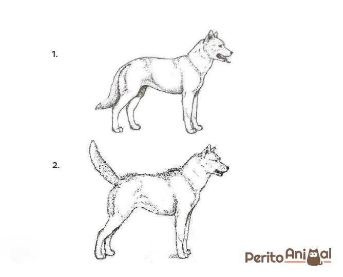 - Na primeira figura, podemos observar um cachorro confiante e estável. Tem a cauda relaxada, as orelhas estão em posição normal e a postura corporal não demonstra medo.