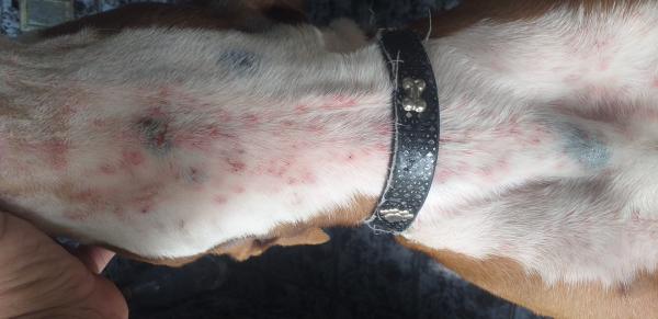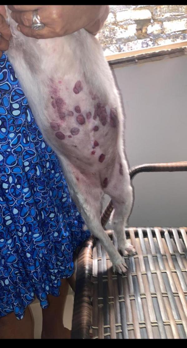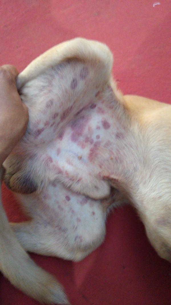 Minha cachorra estar com febre não tá comendo bem e estar com essas manchas vermelhas