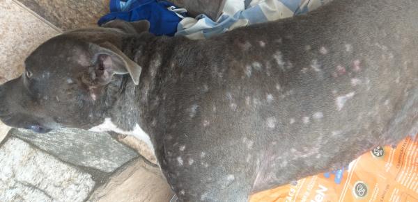 Minha pitbull está com manchas vermelho pelo corpo todo e se cosa muito, chega ficar ferido e sangrando