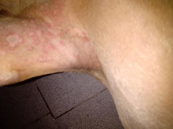 Como pode ver,a minha cadela tem essa ferida, mas tem por toda a parte do corpo, em baixo tem manchas vermelhas,ela às coça e lambe,será grave?