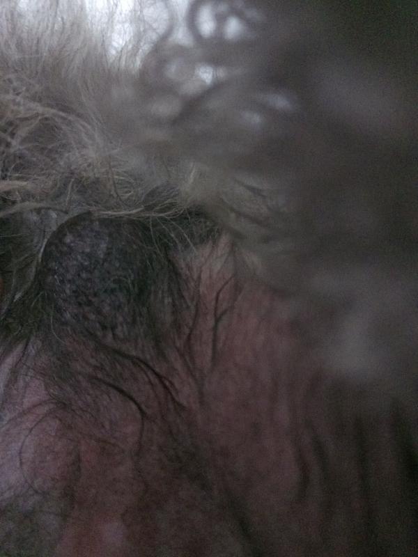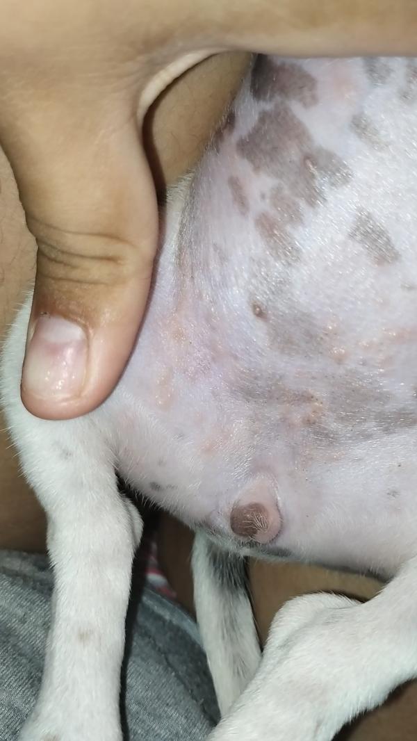 Minha cachorrinha apresentou essa mancha, vejam na foto. Não sei mesmo o que se trata, já pesquisei e não achei nada sobre.