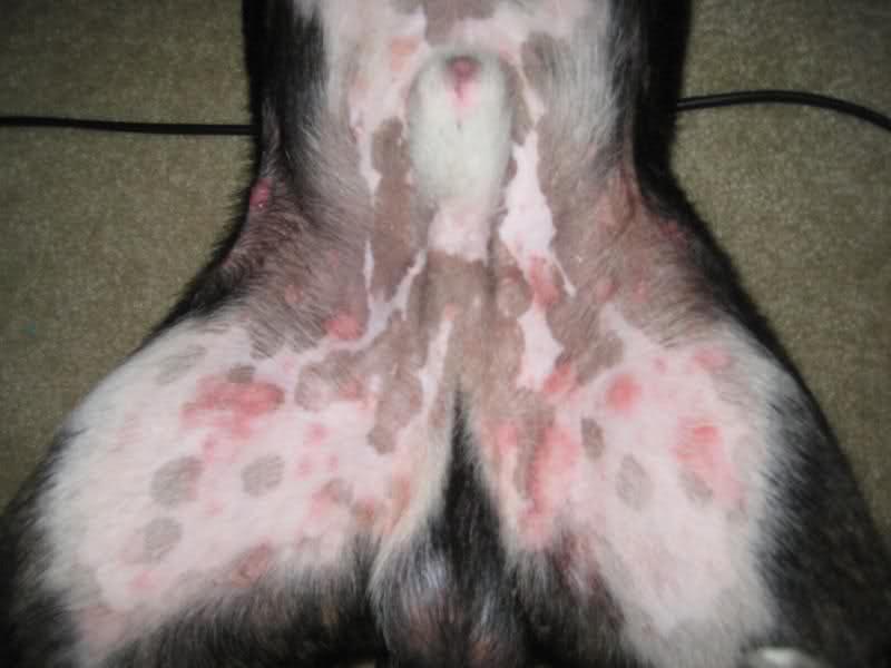 Manchas vermelhas ou negras planas muito características com alopecia em redor (perda de pelo) que parecem um pontilhado semelhante a manchas de sujeira. Inicialmente surgem num só local, mas depois se distribuem por todo o corpo se não tratadas a tempo.