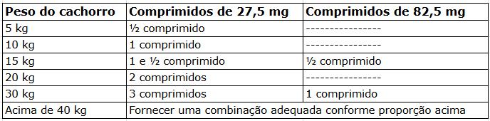 O comprimido pode ser facilmente dividido em duas partes iguais, pois apresenta um vinco que permite que seja cortado sem perdas, facilitando o ajuste da dose. O medicamento deverá ser prescrito pelo médico veterinário, na dose e duração adequadas para cada doença.