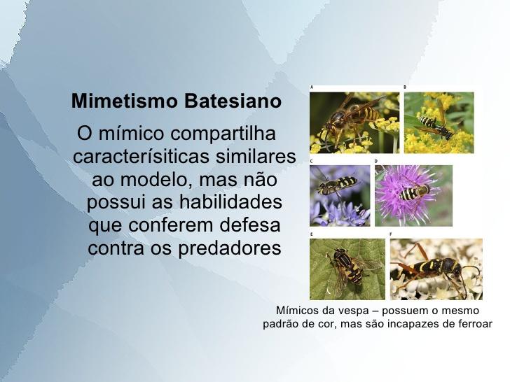 O mimetismo batesiano ocorre quando duas ou mais espécies são aposemáticas e de aparência muito semelhante, mas na realidade apenas uma delas está armada com mecanismos de defesa contra predadores. O outro é conhecido como uma espécie copiadora.