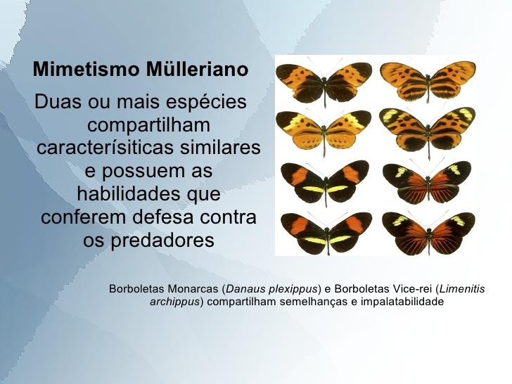 O mimetismo Mülleriano ocorre quando duas ou mais espécies têm o mesmo padrão de cor e/ou forma. Além disso, ambos têm mecanismos de defesa contra seus predadores, como ferrão, presença de veneno ou um sabor muito desagradável. Graças a esse mimetismo, seus predadores comuns aprendem a reconhecer esse padrão e não atacam nenhuma das espécies que o possuem.