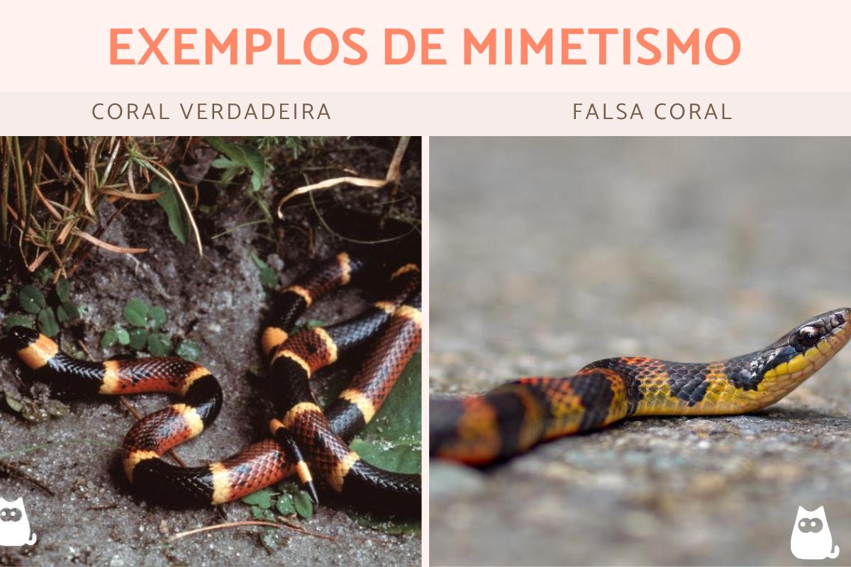 - A cobra-coral-verdadeira (Micrurus), que é letal, imita a falsa-coral (Erythrolamprus), que é menos tóxica.