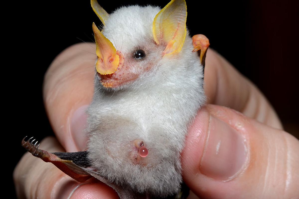 A espécie Ectophylla alba entra na nossa lista de morcegos fofinhos porque chama atenção ao quebrar o estereótipo do morcego preto. Sim, essa espécie frugívora é branca do focinho amarelo e encontrada apenas na América Central.