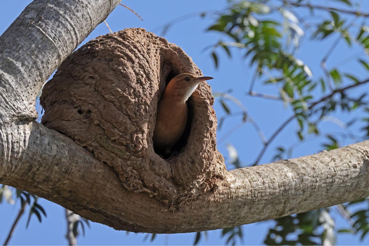O ninho do joão-de-barro não se parece com os ninhos típicos de muitas outras aves, o que o torna particularmente distinto. Trata-se de uma estrutura sólida de barro com formato de forno ou de domo, que costuma contar com uma câmara interna e um túnel de entrada lateral. Seu projeto inclui paredes grossas que proporcionam isolamento térmico e proteção contra predadores. A superfície exterior costuma ser rugosa, enquanto a câmara interna é revestida com materiais mais macios, como penas e fibras vegetais, criando um espaço seguro e confortável para os filhotes. Esta arquitetura é única entre os furnarídeos e distingue os joões-de-barro de outras aves.