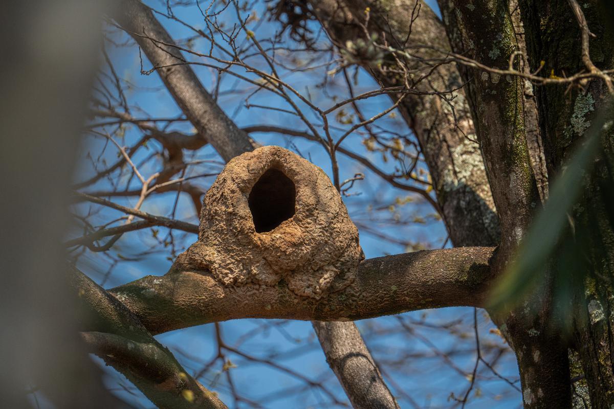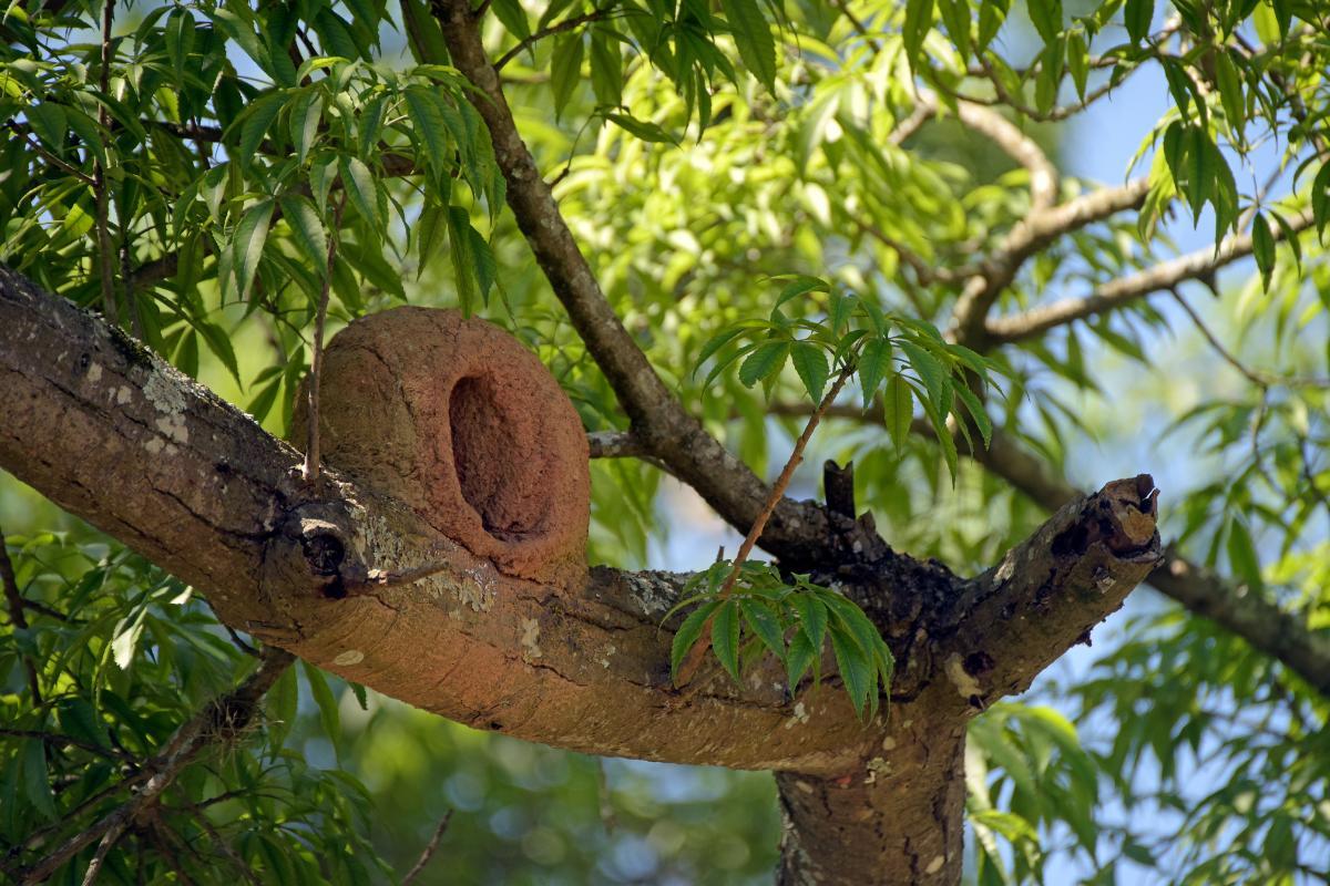 O joão-de-barro constrói seu característico ninho de barro com uma mistura praticamente perfeita, digna de um verdadeiro construtor. Para isso, combina terra argilosa com água e incorpora fibras vegetais, como raízes finas, gramas secas e folhas. Além disso, adiciona esterco, pequenas pedras, gravetos e até pelos de animais, o que confere resistência e coesão à estrutura. Por outro lado, a câmara interna do ninho costuma ser revestida com penas, pelos ou fibras mais macias, criando um microambiente protegido para os ovos e filhotes. Esta cuidadosa seleção de materiais combina rigidez, isolamento térmico e conforto dentro do ninho.