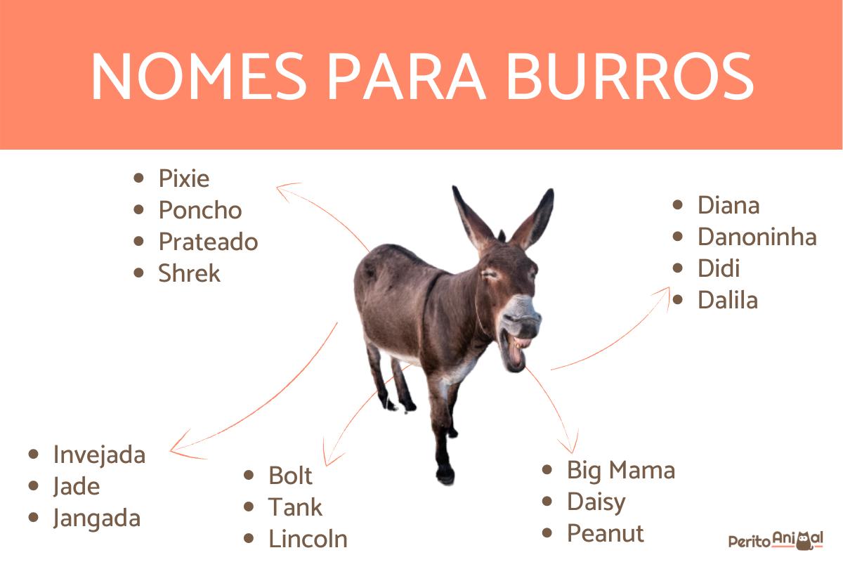Esclarecido este ponto, é importante saber que o tamanho e características físicas do burro variam conforme a raça dele. Você pode usar as características dele para escolher o nome. O importante é que escolha um nome do seu agrado e que seja simples se quiser que o burro responda ao nome dele. Idealmente o nome deve ter duas as três sílabas, para facilitar a aprendizagem. Também é importante que o nome seja de fácil pronunciação.