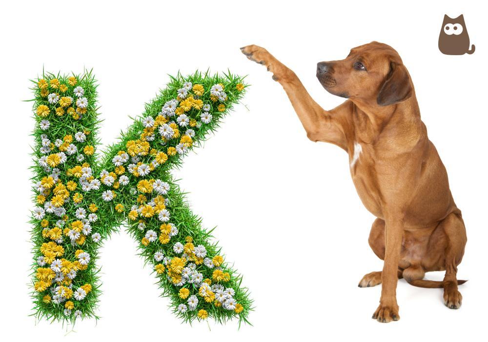 A letra "k" é a oitava consoante do abecedário e uma das mais sonantes de todas. Ao pronunciarla, não passa despercebido o forte som que origina, a energia e o dinamismo, pelo que nomes que comecem por esta letra, encaixam na perfeição com cachorros igualmente fortes, ativos, energéticos e alegres. Assim mesmo, devido à sua origem[], foi relacionada a letra "k" à guerra e a sua grafia pode representar perfeitamente a uma mão ou punho erguido. Por isso, também denota liderança.