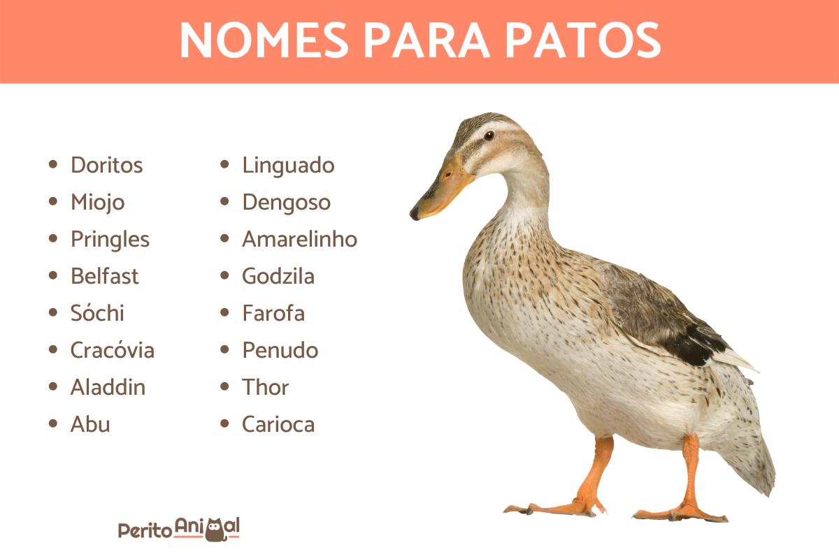 O pato, como animal de estimação ou não, é capaz de identificar sons. Para que você consiga manter uma boa interação com os patinhos que adotou, é importante escolher nomes para chamá-los sempre que quiser a atenção deles. Separamos algumas sugestões de nomes para te ajudar a escolher a sugestão perfeita: